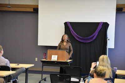 Alt Text: 2025 First Place Award Winner Brenda Koumondji speaking at the Mary Ann Bolton Award Ceremony.