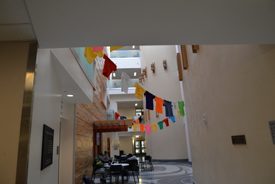 Alt Text: Decorated shirts hung on clotheslines off the balconies in Sabin Hall. Students are studying at tables beneath the hung shirts.