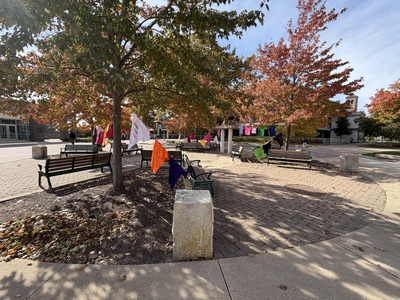 Alt Text: Decorated shirts hanging on clotheslines strung between trees, benches, and a sculpture in the commons area outside of Maucker Union.