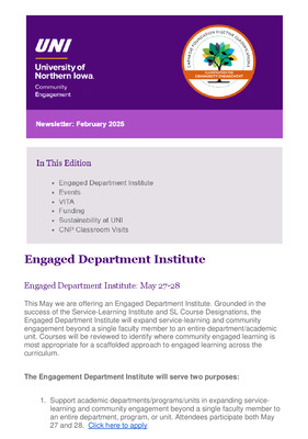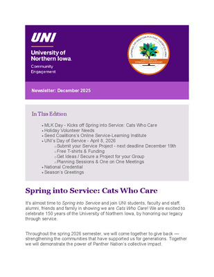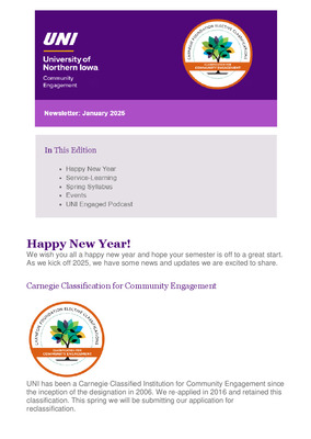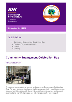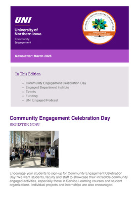 "The purpose of our office is to provide support for strategic partnerships between UNI and the community. We believe our collective work in partnership with the community can best prepare UNI graduates to become civic-minded professionals, launching successful careers and caring, engaged citizens that contribute to the betterment of society." - Dr. Julianne Gassman, Director & Professor, UNI Office of Community Engagement