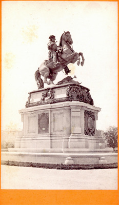 A carte-de-visite photograph of the Equestrian Statue of Friedrich Wilhelm the Great Elector set in front of the Charlottenburg Palace in Berlin Germany. The statue was created by Andreas Schlüter in 1708 and depicts the Great Elector on horseback with slaves in chains around the base of the statue. The relief on the base of the statue is dedicated to King Friedrich I (1657-1713), the son of the Great Elector, who had become the Prussian king by the time the statue he commissioned had been finished.