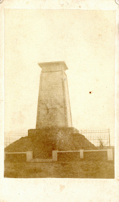 This carte-de-visite photograph shows the Commodore Perry Landing Memorial, which honors Navy officer and commander of the United States East India Squadron, Matthew Perry, who landed in this spot in 1853. It was erected on July 14, 1901 to commemorate the 48th anniversary of the landing of Commodore Matthew Perry in a village named Kurihama, which was integrated into the city of Yokosuka.