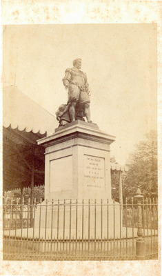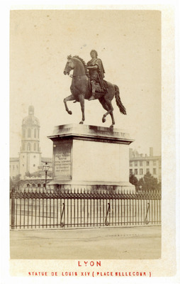 A carte-de-visite historical photograph of the Equestrian Statue of Henri IV. The Baroque statue was set up in honor of the French monarch Henry IV. In 1614, and then taken down during the French Revolution in 1792. It was replaced in 1818.