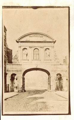 This carte-de-visite photograph shows the Temple Bar Gate in London. The gate allowed entrance through the defensive walls surrounding the medieval city. Originally completed in 1672, the gate was taken down in 1878 and reconstructed in a different location. In 2004, the gate was moved back into the city where it remains today.