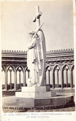 This carte de visite photograph shows the Gothic Angel of Resurrection statue that was placed in the center of the Memorial Well in Cawnpore to commemorate British Victims of the Indian Mutiny of 1857. The Angel statue was placed over the opening of the well where the bodies were thrown in. It was put up in 1866 and was then later removed in 1947 following India gaining independence. It was then moved to the Kanpur Memorial Church.