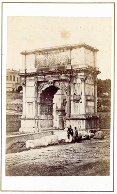 This carte-de-visite photograph shows the Arch of Titus, a Roman triumphal arch built around c. 81 C.E. To honor Emperor Titus and the Fall of Jerusalem. One of its reliefs depicts the spoils from the Jewish Temple taken during the 1st Jewish-Roman War.