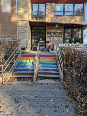 Front view of the ThreeHouse in Cedar Falls, IA, on College St. The staircase pictured is painted to represent the LGBTQIA+ Pride Flag.