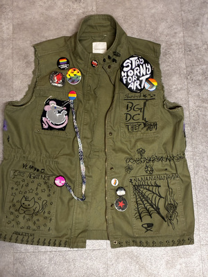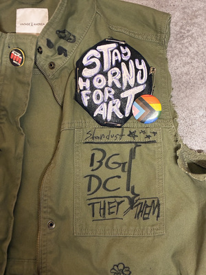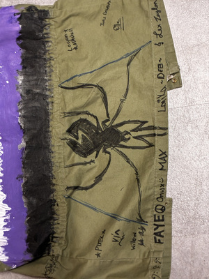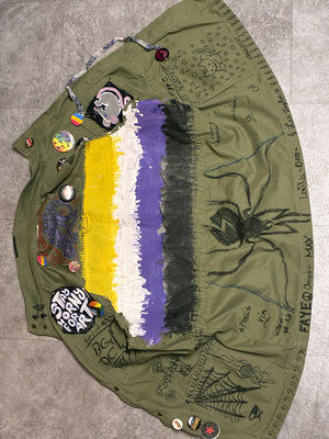 The jacket originated in the WGS-2040 Introduction to LGBTQ Studies class as a passion project from one of the students. The jacket features signatures of all the students in the class as well as different emblems and symbols of queer history. It serves as a relic of the class and the continuity of LGBTQ education and community.