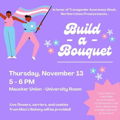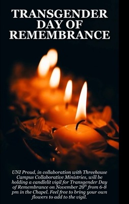 Transcription: Transgender Day of Remembrance, UNI Proud, in collaboration with Threehouse Campus Collaborative Ministries, will be holding a candlelit vigil for Transgender Day of Remembrance on November 20th from 6-8pm in the Chapel. Feel free to bring your own flower to add to the vigil.