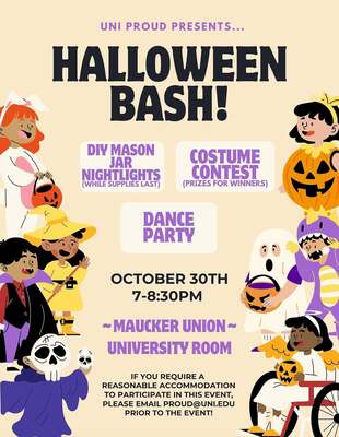 A digital flyer for the UNI Proud 2025 Halloween Party. The even took place from 7:00-8:30 in the University Room of Maucker Union.