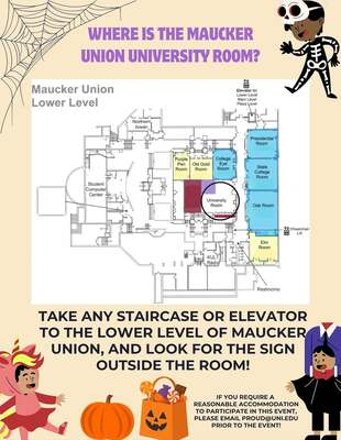 This is the back of a Halloween Bash Flyer from 2024. It shows a map of how to get to the University Room in Maucker.