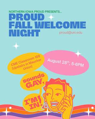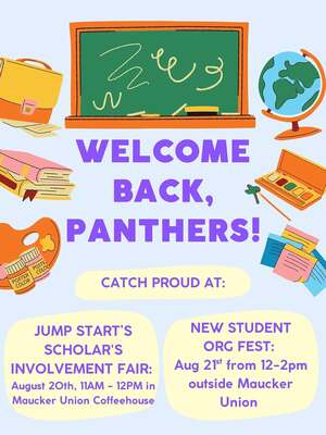 A poster in bright colors advertising 2 different events at which UNI Proud will be present. Transcription: Welcome Back, Panthers! Catch Proud at: Jump Start's Scholar's Involvement Fair: August 20th, 11AM - 12PM in Maucker Union Coffeehouse; New Student Org Fest: August 21st from 12-2pm outside Maucker Union