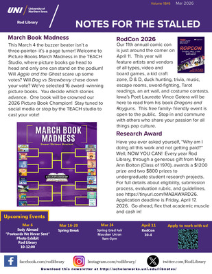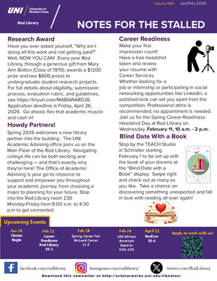 The Rod Library newsletter, Notes for the Stalled, is a monthly publication highlighting news, events, and information about the Rod Library at the University of Northern Iowa.