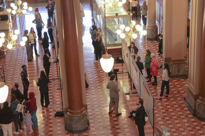 Alt Text: An aerial view of the presentation area inside the Capitol building.