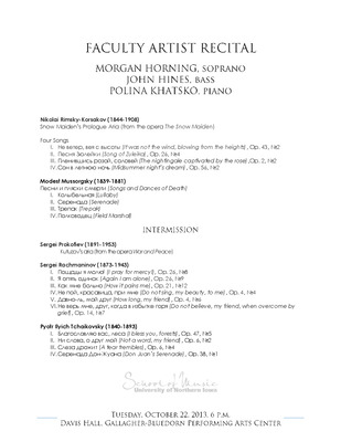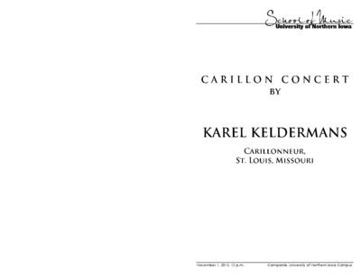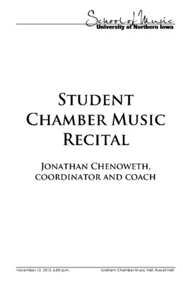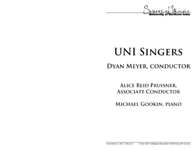 Program of a music recital given by faculty, students, or guest artists from the School of Music at the University of Northern Iowa.