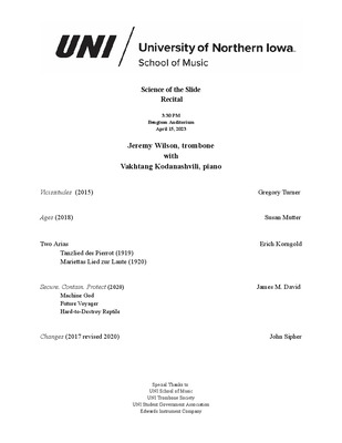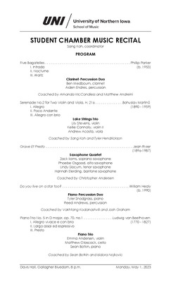 This sub-collection contains music recital programs performed during the Spring 2023 semester sponsored by the School of Music at the University of Northern Iowa. This collection is a subset of the larger Music Recital Programs collection.