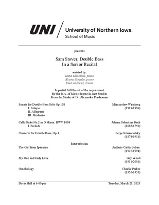 Sam Stover, Double Bass, in a Senior Recital, March 21, 2023 [program]