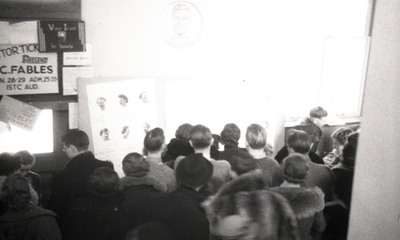 A group of people are gathered in the Crossroads hallway, looking at poster boards to vote in the Old Gold Beauty contest. The original description of the photo negative strip included "Old Gold Beauty voting at Crossroads".