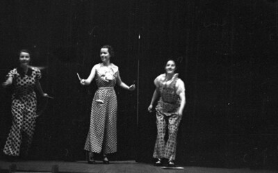 Three women trying out for Tutor Ticklers. The original description of the photo negative strip included "Paddling Preps" and "Tutor Tickler Tryouts".