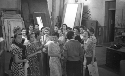 A group of women waiting backstage for Tutor Tickler tryouts. The original description of the photo negative strip included "Paddling Preps" and "Tutor Tickler Tryouts".