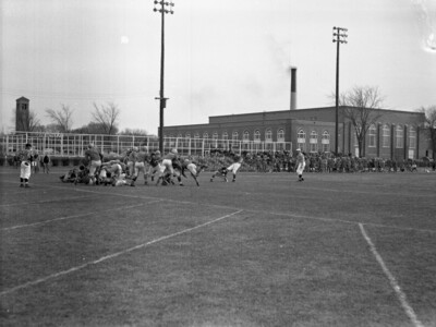 A football action shot of a game against South Dakota State. The bleachers, Campanile, and West Gym are in the background. The original description of the photo negative strip included "South Dakota State Football Game Satch Smitty 52".