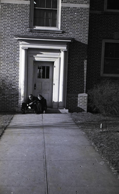 Two students sit on the doorstep at an entrance to Bartlett Hall. The original description of the photo negative strip included "Campus Scenes - student life Spring 1938, Commons Park, Swimming Pool, Bartlett Hall".