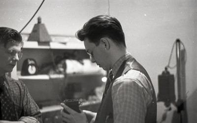 Two men examining an object in a room that has shelves along the back wall. The original description of the photo negative strip included "Library [quizzicle?] [stude?]".