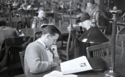 In the foreground, a man reads a book at a table in the library in Seerley Hall. There are other students in the background. The original description of the photo negative strip included "Library shots".