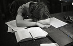 A woman sleeps at a table in the Seerley Hal library, with her head resting on her crossed arms and books scattered across the table. The original description of the photo negative strip included "Campus scenes" and "Girl sleeping".