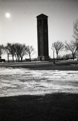 The Campanile in winter with some snow on the ground and the sun shining in the upper left. The original description of the photo negative strip included "Admin building, Bartlett Hall, Campanile, Campanile (sun)".