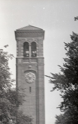 A blurry shot of the upper half of the Campanile, framed by trees. The original description of the photo negative strip included "Commons, Campanile".