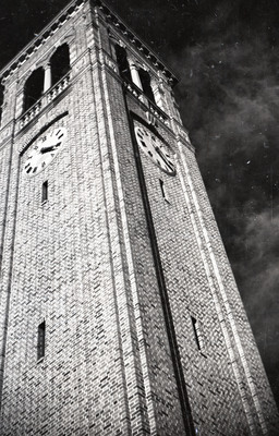 An upward shot of the Campanile taken near its base, a dark sky and clouds in the background. The original description of the photo negative strip included "Commons, Campanile".