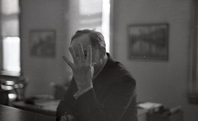 Benjamin Boardman holding his hand with four fingers raised in front of his face. He is in an office with desks and paintings on the wall behind him. The original description of the photo negative strip included "Dana Campbell", "Benj. Boardman", and "Mrs. Baughtman".