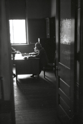 Amy Arey at her office desk. The photo is taken from outside the office's open door. The original description of the photo negative strip included "Charles J.W., Martha Strayer, library student, (bad), Amy Arey, Beatrice Geiger".