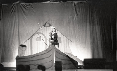 An actress with a pole posed on a faux houseboat. The original description of the photo negative strip pack included "60th Anniversary ISTC 1936".