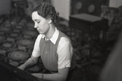 A woman plays piano in a carpeted room. She is also pictured in nit_00661.
