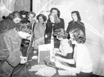Women gathered around a table for Future Business Leaders of America Press Day. The original description of the photo negative strip included "Press Day F.B.L.A." The photo surface shows deterioration.