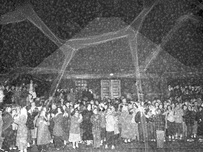 A crowd in winter clothing gathered outside a building for Future Business Leaders of America Press Day. The original description of the photo negative strip included "Press Day F.B.L.A." The photo surface shows deterioration.