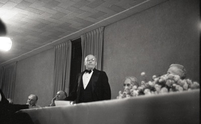 A man in formal wear stands and speaks at a banquet table. The original description of the photo negative strip pack included "60th Anniversary ISTC 1936".