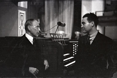 Two men converse next to an organ, with a stage in the background. They are also pictured in nit_00754. The original description of the photo negative strip pack included "60th Anniversary ISTC 1936".