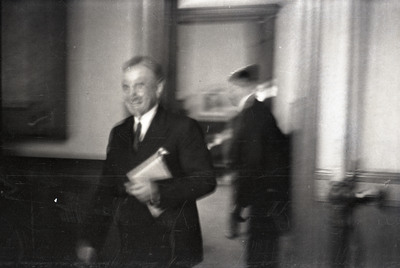A blurry shot of two men walking out of an office. The original description of the photo negative strip pack included "60th Anniversary ISTC 1936".