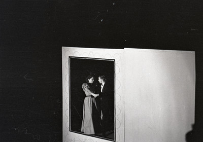 An actress in a light-colored dress holds an object and is posed in a life-size frame that resembles a photo album page. Another actor is visible behind the book, as are the music stands of the pit orchestra across the front. The original description of the photo negative strip pack included "60th Anniversary ISTC 1936".