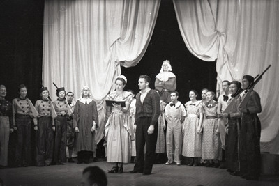 A group of performers on a stage in various costumes, with a couple at the center, a half circle behind them, and someone in a royal outfit elevated in the back. The original description of the photo negative strip pack included "60th Anniversary ISTC 1936".